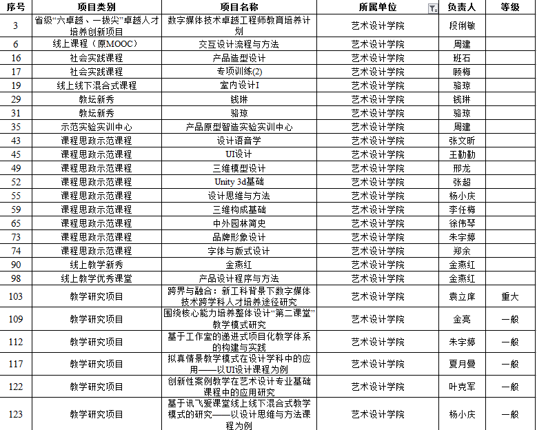20202020jyxm0826教学研究项目基于工作室的递进式项目化教学体系的构建与实践朱宇婷阶段检查良好20202020jyxm0837教学研究项目围绕核心能力培养整体设计“第二课堂”教学模式研究金亮阶段检查合格20202020jyxm0839教学研究项目拟真情景教学模式在设计学科中的应用——以UI设计课程为例夏月曼阶段检查优秀20202020jyxm0827教学研究项目基于讯飞爱课堂线上线下混合式教学模式的研究——以设计思维与方法课程为例杨小庆阶段检查合格20202020jyxm0833教学研究项目创新性案例教学在艺术设计专业基础课程中的应用研究——以设计色彩课程为例叶克军阶段检查合格20202020jyxm0841教学研究项目跨界与融合:新工科背景下数字媒体技术跨学科人才培养途径研究袁立庠阶段检查良好20192019jyxm0893教学研究项目项目实践,交叉融合——工程教育背景下的环境设计专业人才培养模式研究张慧结题验收良好20202020zyrc082省级“六卓越、一拔尖”卓越人