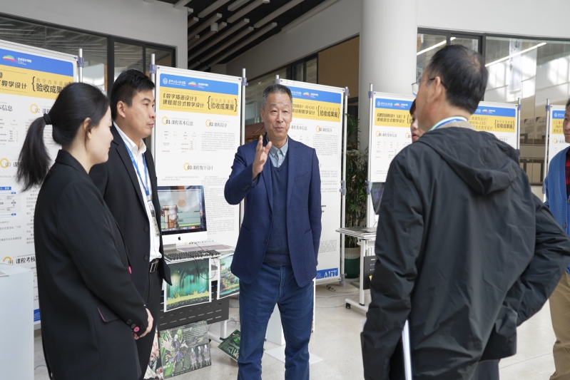 为进一步做好项目制课程与混合式课程建设工作,全面总结学科建设经验。11月6日,艺术设计学院在艺术楼一楼展厅举办了项目制和混合式课程教改课程验收成果展。成果展邀请了校长吴敏、副校长朱尚玉、教育质量与评估办公室主任兼教务处副处长程玉林、教务处副处长孙怡川参加了课程验收成果展,艺术设计学院副院长周建、钱琳、骆琼、课程建设负责人教师以及部分骨干教师参加了展出并交流经验。(图为吴校长亲临成果展现场) 成果展上,艺术设计学院共建设项目制课程与混合式课程共61门,其中达到优秀的教改课程12门,良好31门,优良率达到70%。艺术设计学院以本次课程验收成果展为契机,进一步加强项目制和混合式课程建设的执行和监督力度与推广力度,课程负责人严格对照课程建设要求,完善课程目标,优化课程内容,创新课程设计,丰富课程资源,加强课程应用,注重课程考核,做好课程的持续改进与迭代完善。(图为成果展现场) 课程负责人分别就项目制与混合式课程做了系统交流分享,邢龙老师从项目教学设计、项目实施过程、考核与评价、问题与反