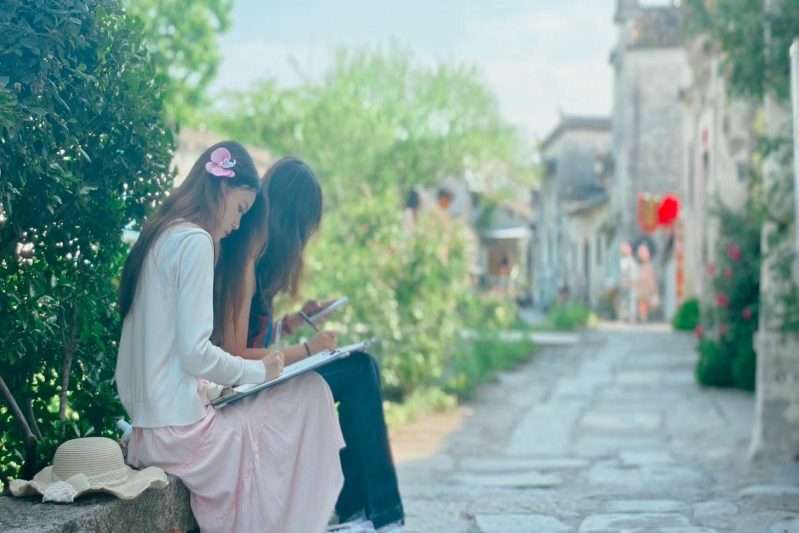为深化艺术设计类专业学生的实践能力与文化感知力,安徽信息工程学院艺术设计学院于5月11日至5月17日组织2024级产品设计、环境设计、视觉传达设计专业师生,赴安徽黟县屏山写生基地开展为期一周的实践教学活动。此次活动以“徽州古韵·设计新生”为主题,将传统写生与非遗体验、文化考察相结合,助力学生从自然与人文中汲取创作灵感,探索艺术与设计的融合路径。(图为屏山写生照片)   此次写生特别增设非遗文化实践模块。学生们在屏山基地体验了传统扎染与蜡染工艺,通过浸染、捆扎、绘图等步骤,将徽州山水意象转化为布艺作品。环境设计专业学生李同学表示:“扎染的随机性与设计感让我重新思考‘自然’与‘人工’的平衡,这种传统技艺的现代转化对空间设计启发深远。”活动不仅让学生感受到非遗的魅力,更激发了他们对传统文化活态传承的责任感。(图为学生扎染、蜡染照片)   写生期间,师生还前往齐云山景区采风。齐云山以其丹霞地貌、道教文化与徽派古民居闻名,山间的摩崖石刻、太素宫、月华街等景观,成为学生创作的灵感源泉。视觉传达设计专