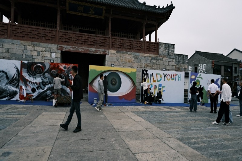 2025年9月下旬期间,受芜湖古城官方邀约,安徽信息工程学院艺术设计学院空间设计与表现社团在环设专业老师张涛的带领下,与3A级景区芜湖古城合作,积极投身“野生・青年灵感派对”核心环节——先锋艺术・青年涂鸦展。本次社会实践活动以芜湖古城标志性建筑谯楼广场为创作基地,借助画笔为媒,为千年古城注入青春艺术活力,在师生共同协作下,顺利完成了为期三天的系列彩绘、涂鸦作品《青红皂白》,不仅以专业技能为景区注入青春艺术活力,激活青年创意动能,同时搭建起高校与社会互动交流的实践桥梁,探索了艺术与文化融合的新形式。(图为彩绘、涂鸦作品《青红皂白》阶段性成果)   活动前期,社团成员围绕景区文化特色进行实地调研,老师们结合芜湖古城建筑的黛瓦白墙、飞檐翘角特色,从色彩调和、构图层次到主题表达,精心规划设计了彩绘方案。在谯楼广场前,杜玉泉、关玉政等社团同学分组协作,通过勾勒线条框架,调配渐变色彩,到细化图案细节,让原本空白的画布在三天时间里,逐渐呈现出兼具现代艺术感与传统韵味的画面,吸引不少市民驻足拍照。整个过