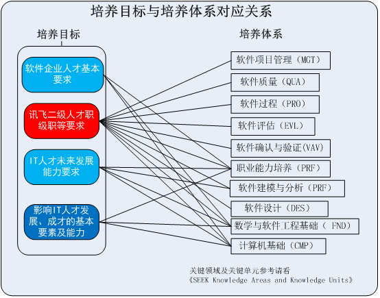 计算机与软件工程学院培养体系构建参考一系列依据计算机工程协会ACM和美国IEEE制定的毕业生要求,结合讯飞人才需求,融合现代计算机技术和软件工程领域先驱和奠基者之一David Parnas对软件人才要求观点,提炼出基于学生实际的计算机应用人才体系,明确为:软件企业人才基本要求,讯飞二级人才职级职等要求,IT人才未来能力要求以及影响IT人才发展、成才的基本要素及能力四个方面,如图1所示。