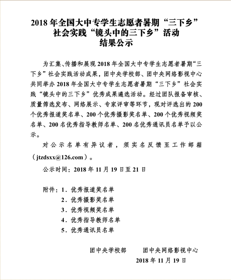 近日,由共青团中央学校部、共青团中央网络影视中心主办,中国青年网、三下乡官网承办的2018年“镜头中的三下乡”大学生志愿者暑期社会实践展示活动结果已公布,经过团队报备审核、质量筛选发布、网络展示、专家评审等环节,最终评选出200个优秀报道奖、200个优秀摄影奖、200个优秀视频奖、200名优秀指导教师、200名优秀通讯员。我校“智能互联”科技支农国家重点团队与北京航空航天大学“赤脚红心”实践队等200个优秀团队荣获“优秀摄影奖”。(图为“三下乡”官网公示获奖名单文件)(图为“三下乡”官网公示获奖名单文件)(图为安徽信息工程学院团队与桑茶基地负责人在种植园内合影 中国青年网通讯员 夏鹏飞 摄)据报道,在2017年此项比赛中,1200余所大中专院校的10000余支团队共计提交了参赛作品60000余件,覆盖学生数量超过100万人。经统计,2018年“镜头中的三下乡”活动中安徽省仅6支团队,芜湖市仅我校智能互联”科技支农帮扶团获此殊荣。(图为安徽信息工程学院团队整齐划一前往目的地 中国青年