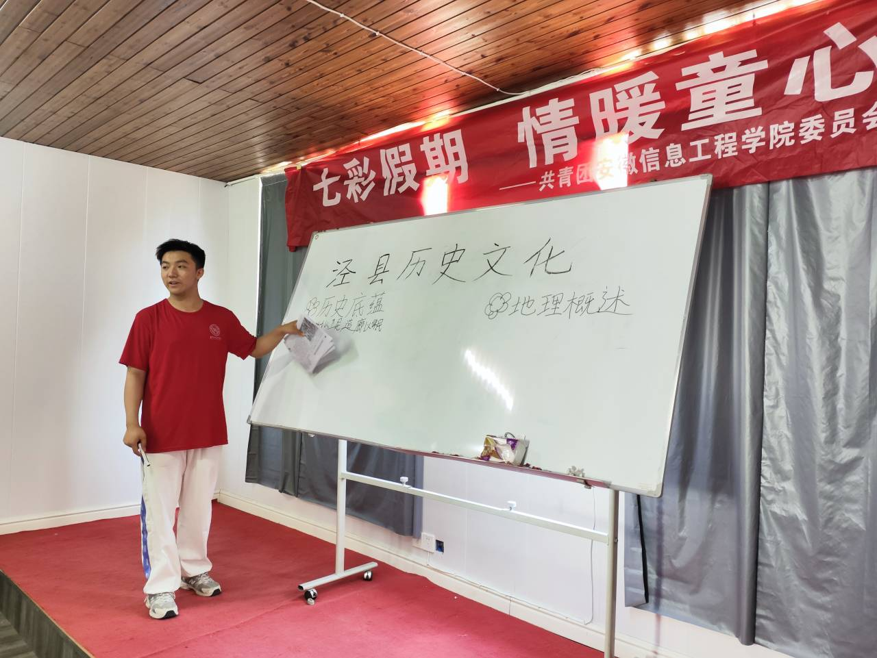 本网讯 为帮助泾县蔡村镇蔡村村小学生们更好地了解自己家乡的历史和文化,提高他们对家乡的关注和热爱,培养他们对地理环境和生物多样性的认知和理解,2023年7月12日,安徽信息工程学院“七彩假期”支教团队泾县分队在蔡村镇蔡村村委会开展“泾县历史文化”课程。(图为支教团成员讲述泾县历史底蕴)泾县作为一个具有悠久历史的地方,承载着丰富的文化遗产。课程初始,支教团成员详细讲解了泾县的起源与演变过程、古代军事要塞遗迹、传统手工艺等,让学生们深入了解了泾县的历史沉淀与传承。随后,支教团成员通过展示地图和图片,向学生们介绍了泾县的地理位置、地势特点以及自然环境等。支教团成员着重强调了泾县的丰富水资源、优美自然风光等,并倡议学生们能够珍惜家乡的水资源,保护自然环境。(图为支教团成员给学生们展示图片)在短暂的课间休息后,支教团成员通过图片和实物为学生们介绍了泾县丰富多样的动植物资源,以及泾县特有的物种,并着重解释了这些物种在泾县生态系统中的作用和重要性,鼓励学生们关注自然,发现自然神奇之美。(图为学生举手回