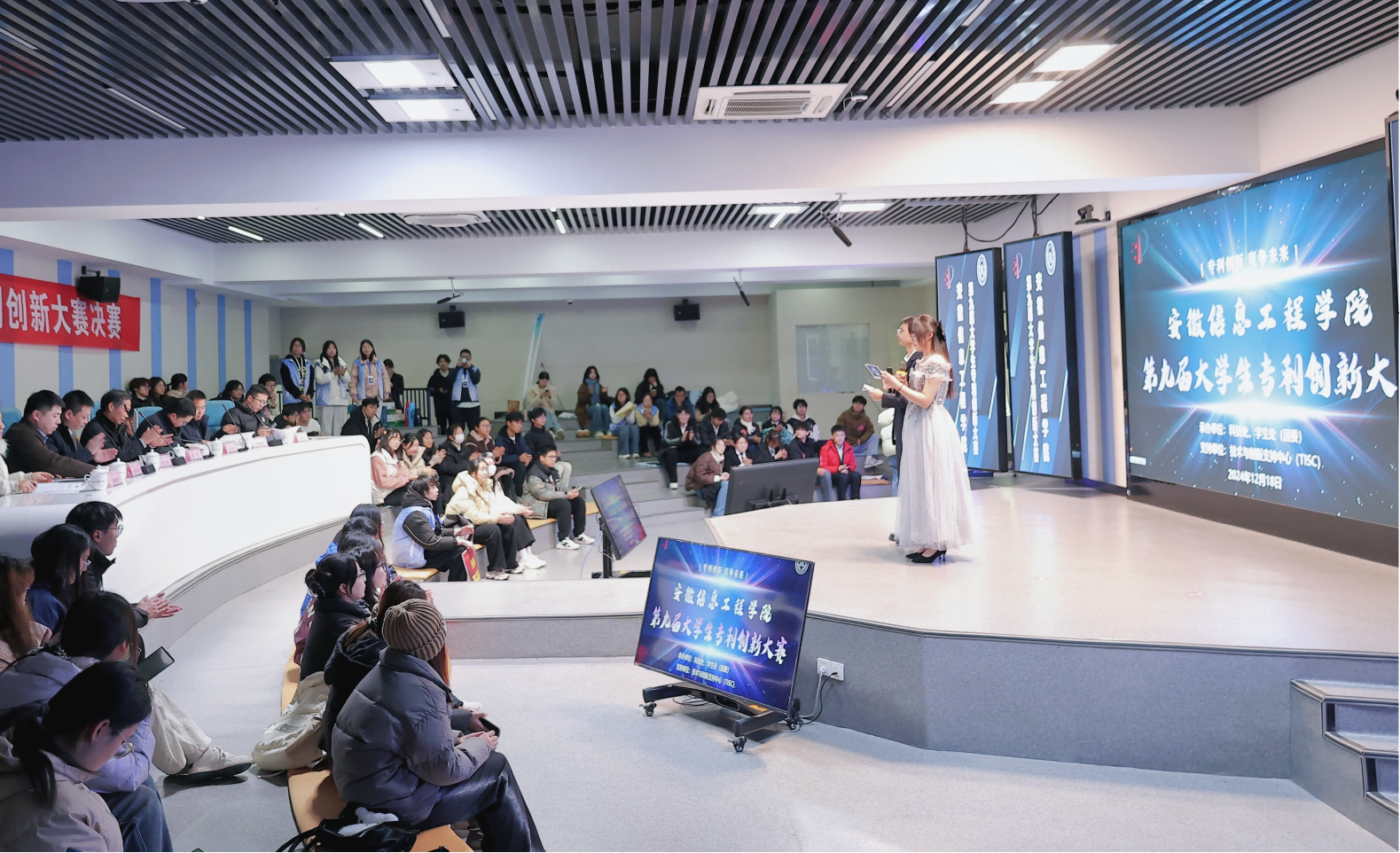 本网讯 12月18日下午,安徽信息工程学院第九届大学生专利创新大赛在A3W401圆满举行。本次大赛由科技处、学生处(团委)主办,技术与创新支持中心(TISC)承办,旨在激发学生的创新思维和实践能力。副校长李震、各二级学院的相关负责人及师生代表共计120余人出席并观摩了大赛。
