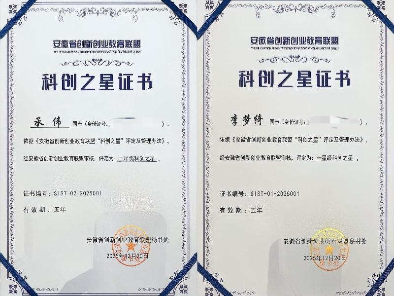 会上,联盟发布年度工作报告,与会专家围绕双创教育改革、人才培养模式创新、产教融合机制深化等核心议题展开深入探讨。在年会表彰环节,“安徽省科创之星培育计划”评选结果正式揭晓,我校紫云英学员表现亮眼:承伟荣获“二星级科创之星”称号,李梦绮荣获“一星级科创之星”称号。