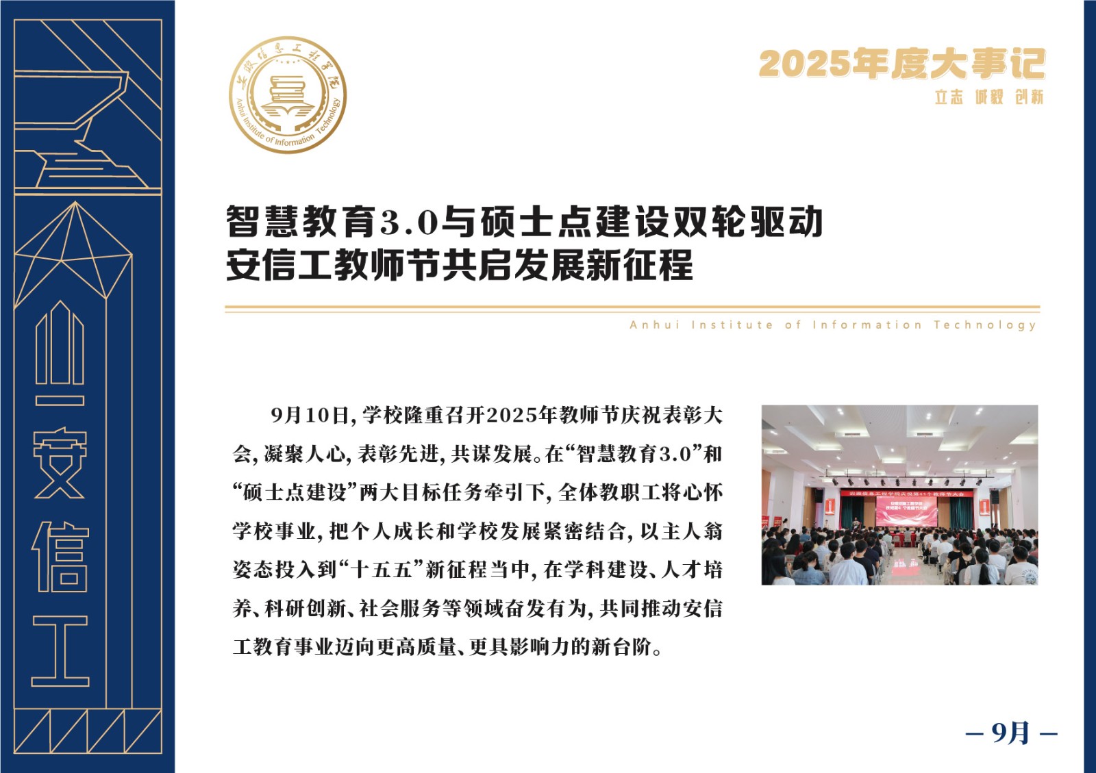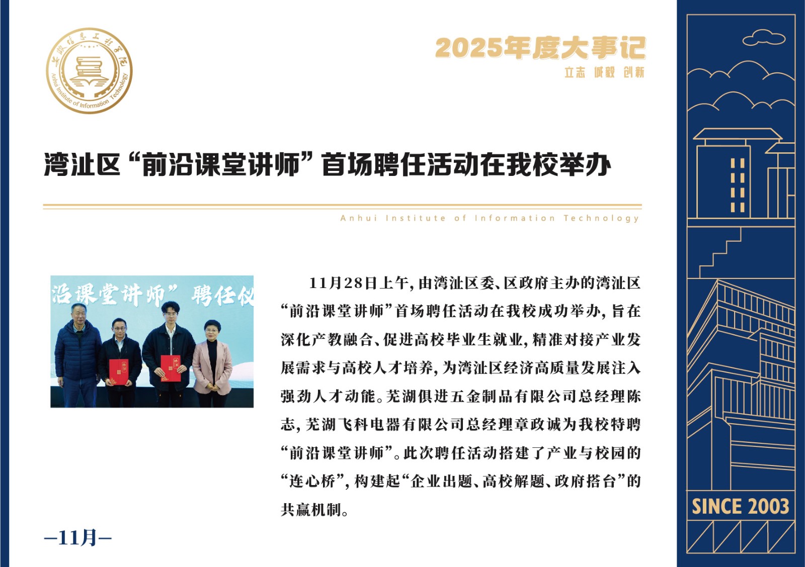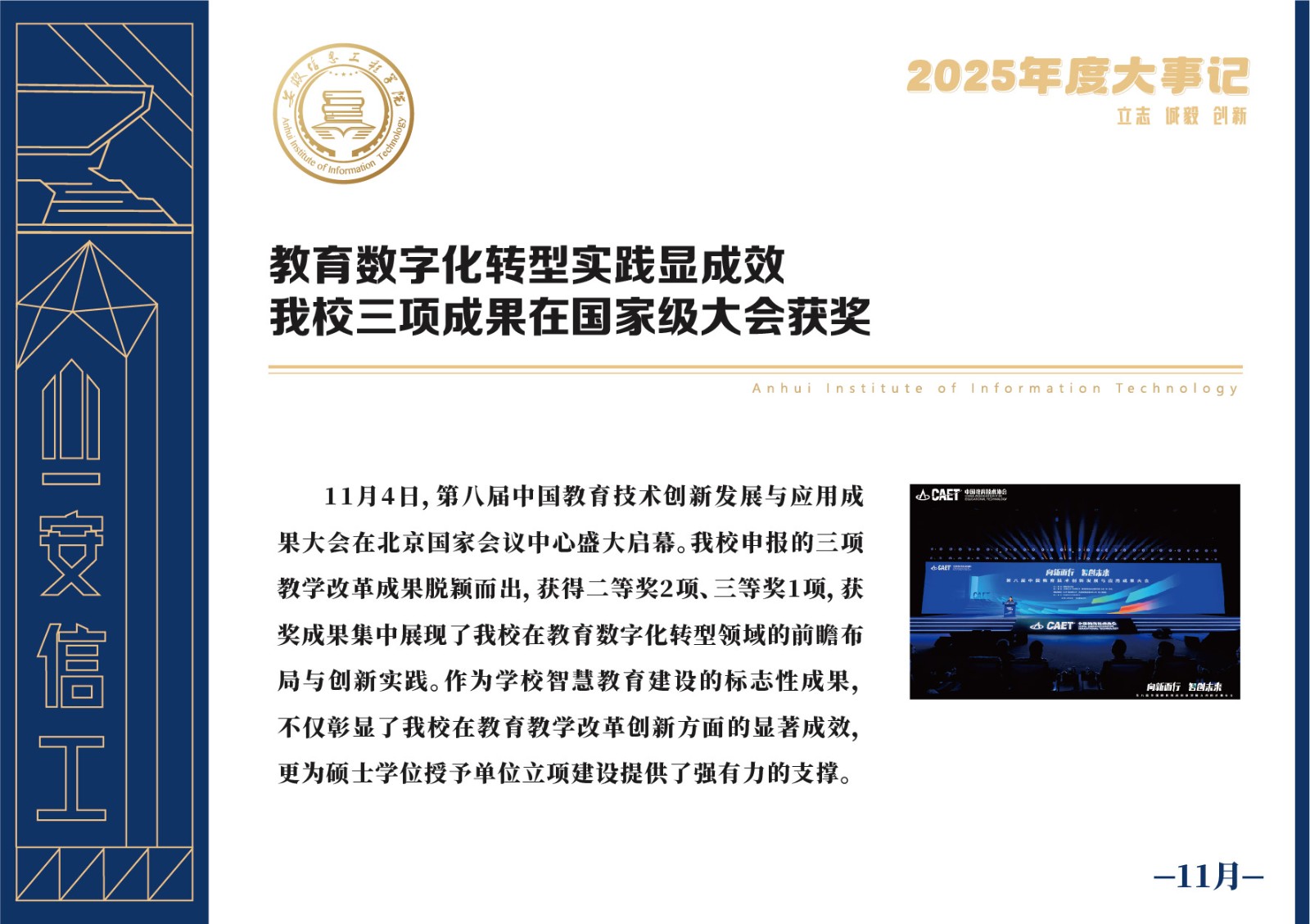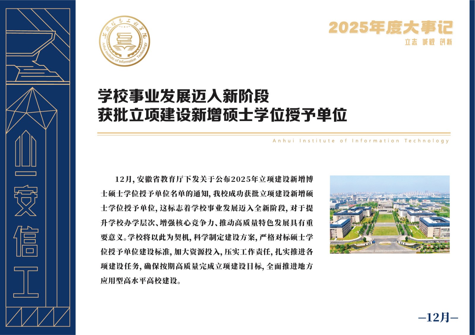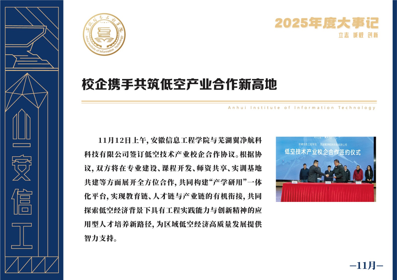 编者按 岁序更迭,华章日新。2025年,是安徽信息工程学院在高质量发展道路上勇攀新峰、跨越前行的一年。这一年,我们高举旗帜、培根铸魂,党的建设坚定有力。这一年,我们聚焦主业、锐意革新,人才培养与教育教学改革结出累累硕果。这一年,我们聚力创新、服务社会,科研能级与学科建设实现历史跨越。这一年,我们以生为本、涵养生态,育人环境与校园文化焕发勃勃生机……每一个事件,都凝聚着信工人的智慧与汗水,每一次跨越,都彰显着学校“为党育人、为国育才”的使命担当。