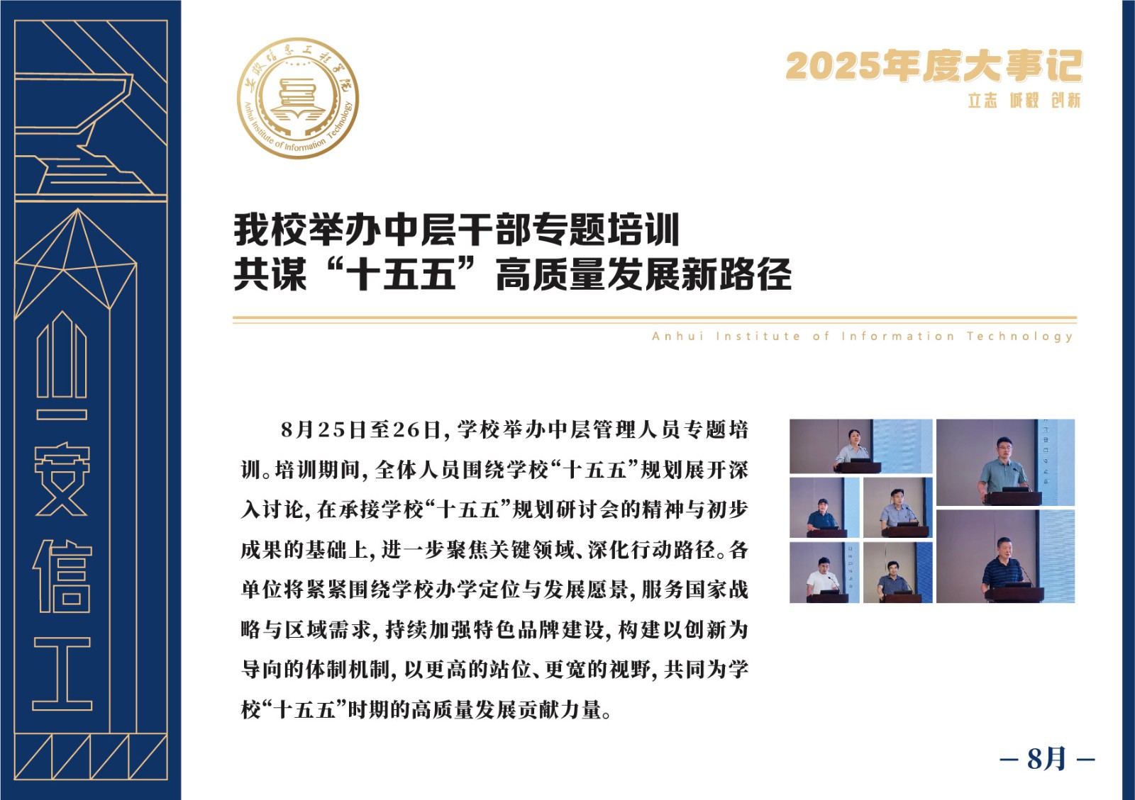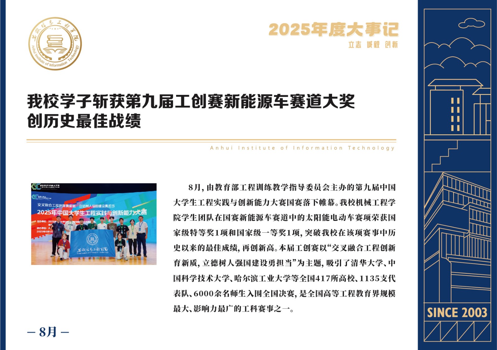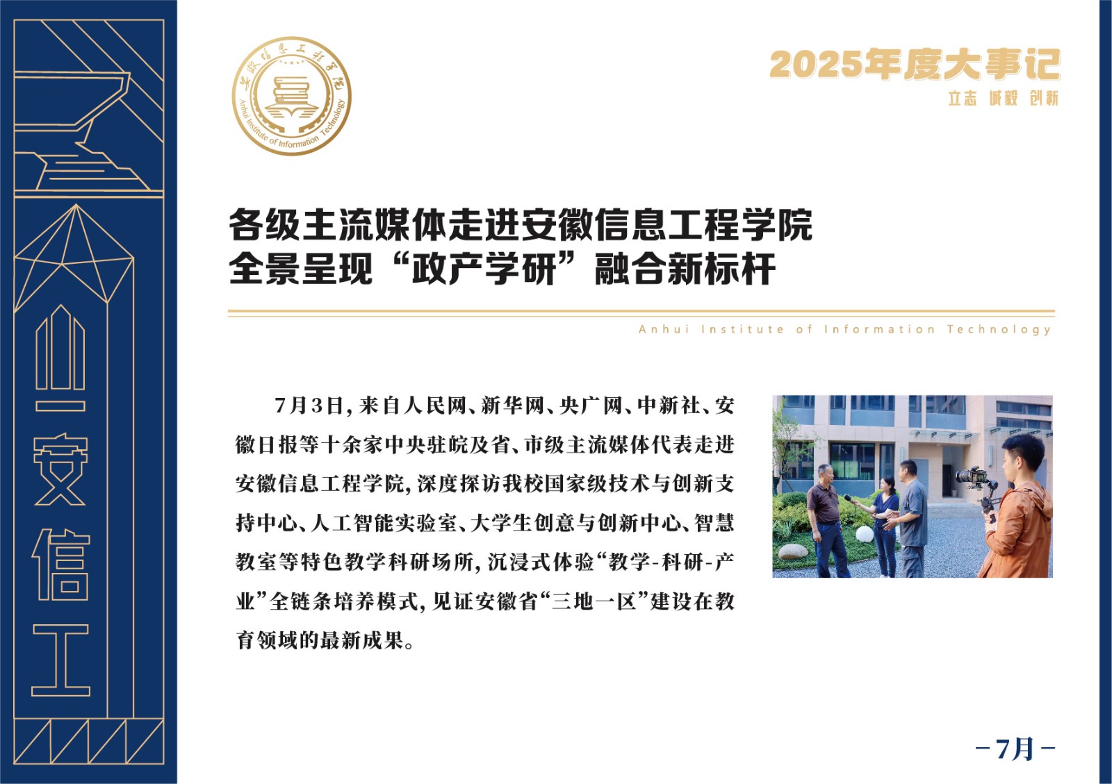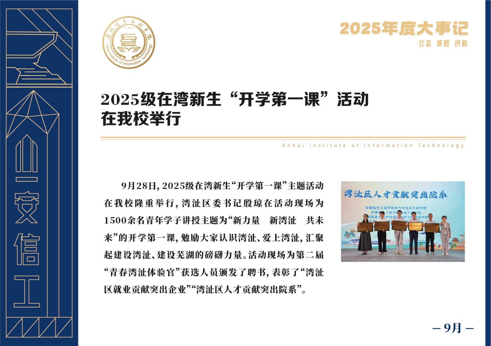 编者按 岁序更迭,华章日新。2025年,是安徽信息工程学院在高质量发展道路上勇攀新峰、跨越前行的一年。这一年,我们高举旗帜、培根铸魂,党的建设坚定有力。这一年,我们聚焦主业、锐意革新,人才培养与教育教学改革结出累累硕果。这一年,我们聚力创新、服务社会,科研能级与学科建设实现历史跨越。这一年,我们以生为本、涵养生态,育人环境与校园文化焕发勃勃生机……每一个事件,都凝聚着信工人的智慧与汗水,每一次跨越,都彰显着学校“为党育人、为国育才”的使命担当。