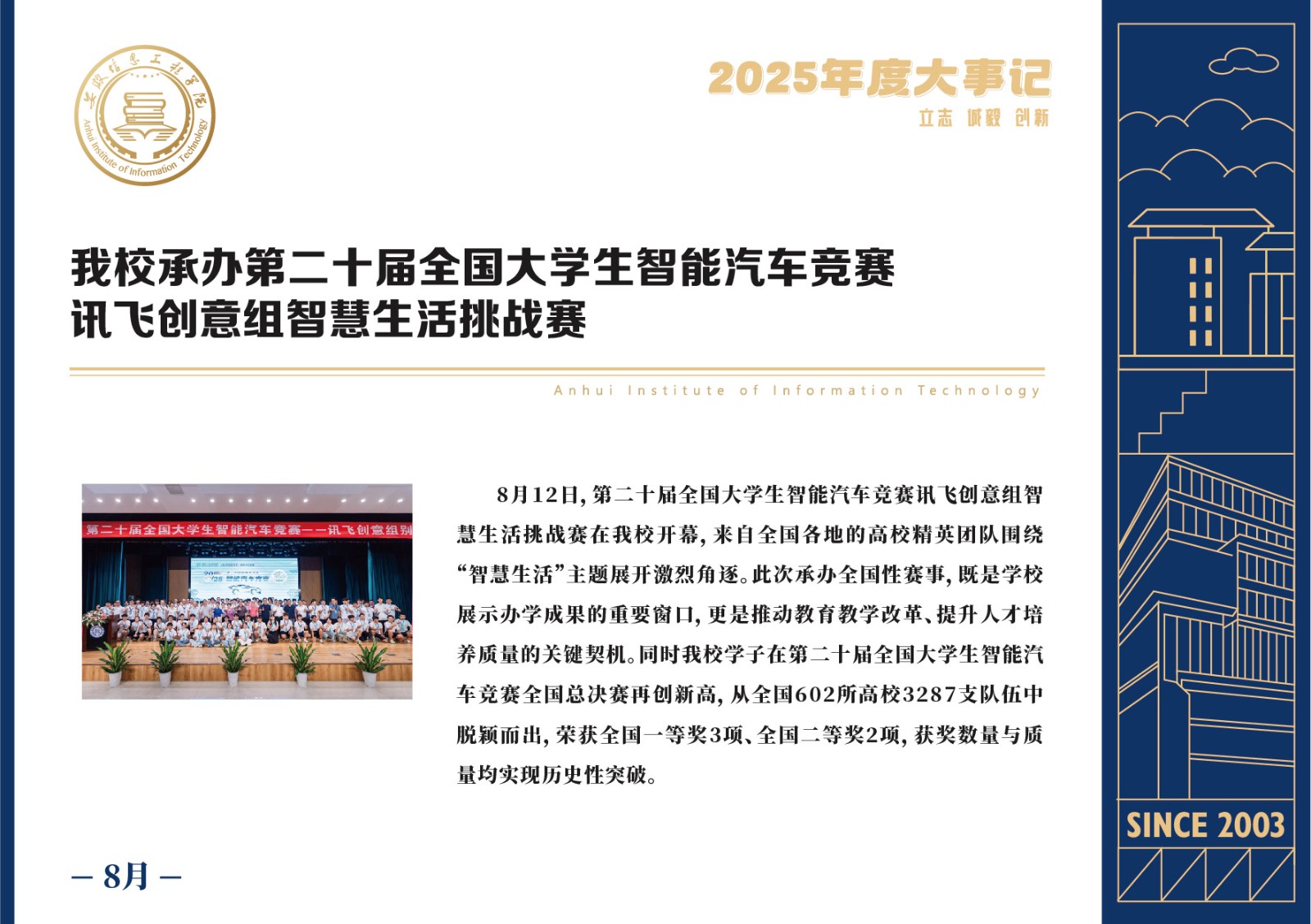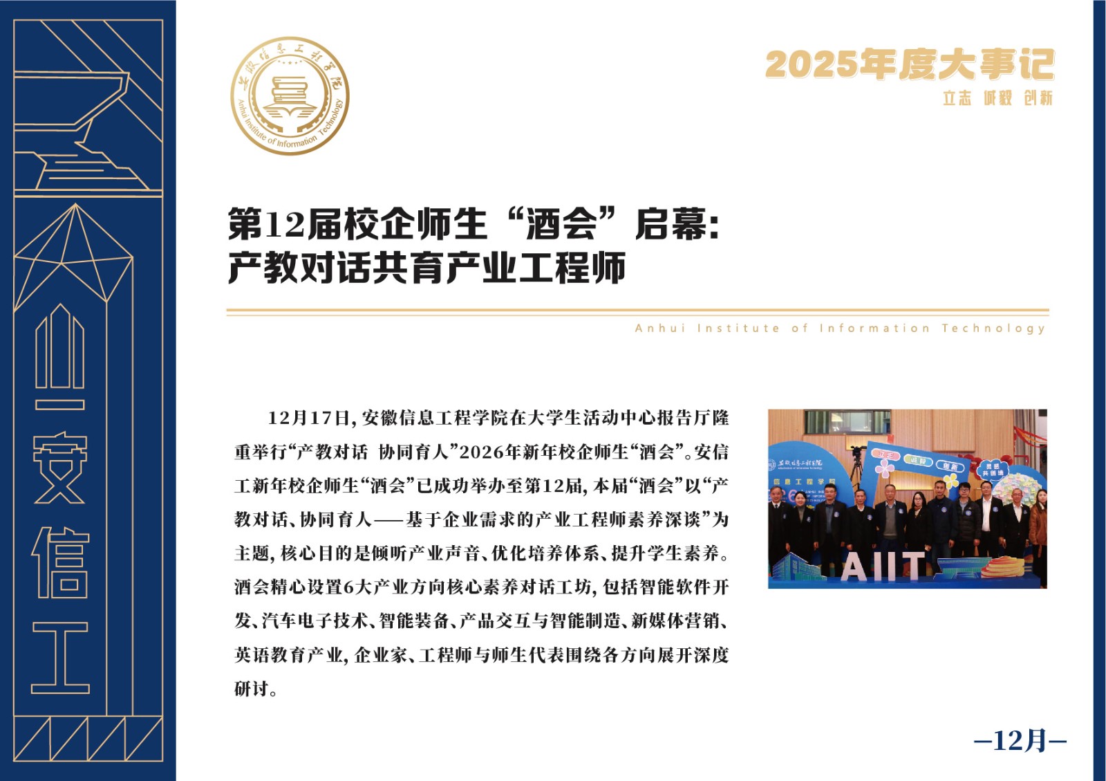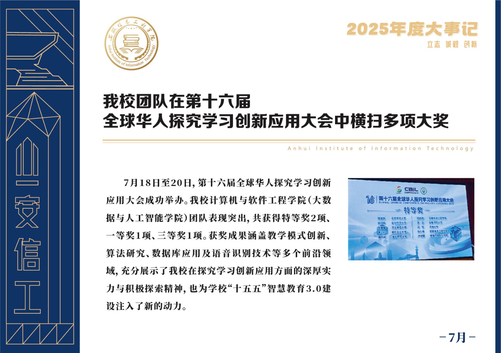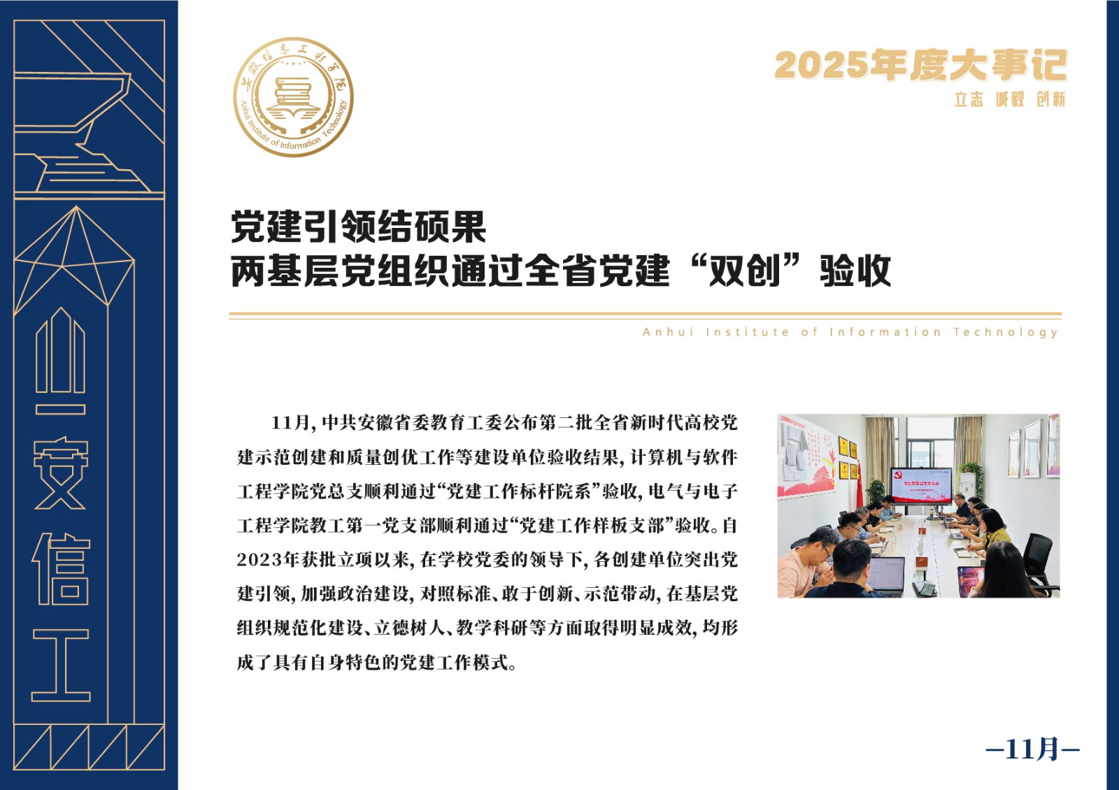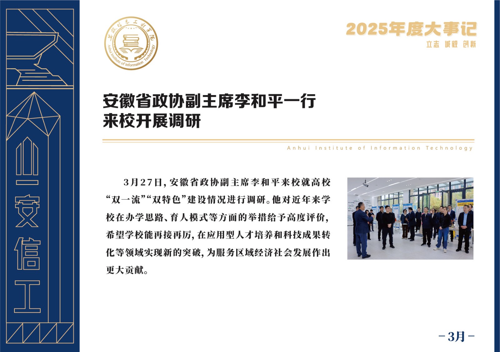 编者按 岁序更迭,华章日新。2025年,是安徽信息工程学院在高质量发展道路上勇攀新峰、跨越前行的一年。这一年,我们高举旗帜、培根铸魂,党的建设坚定有力。这一年,我们聚焦主业、锐意革新,人才培养与教育教学改革结出累累硕果。这一年,我们聚力创新、服务社会,科研能级与学科建设实现历史跨越。这一年,我们以生为本、涵养生态,育人环境与校园文化焕发勃勃生机……每一个事件,都凝聚着信工人的智慧与汗水,每一次跨越,都彰显着学校“为党育人、为国育才”的使命担当。