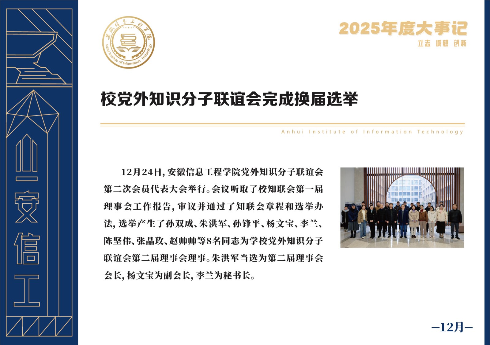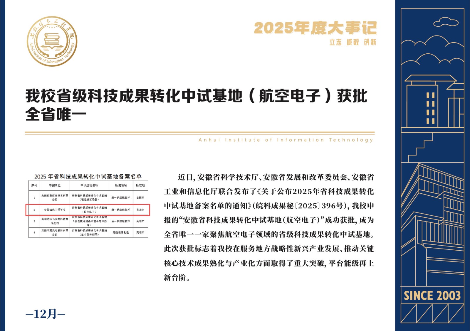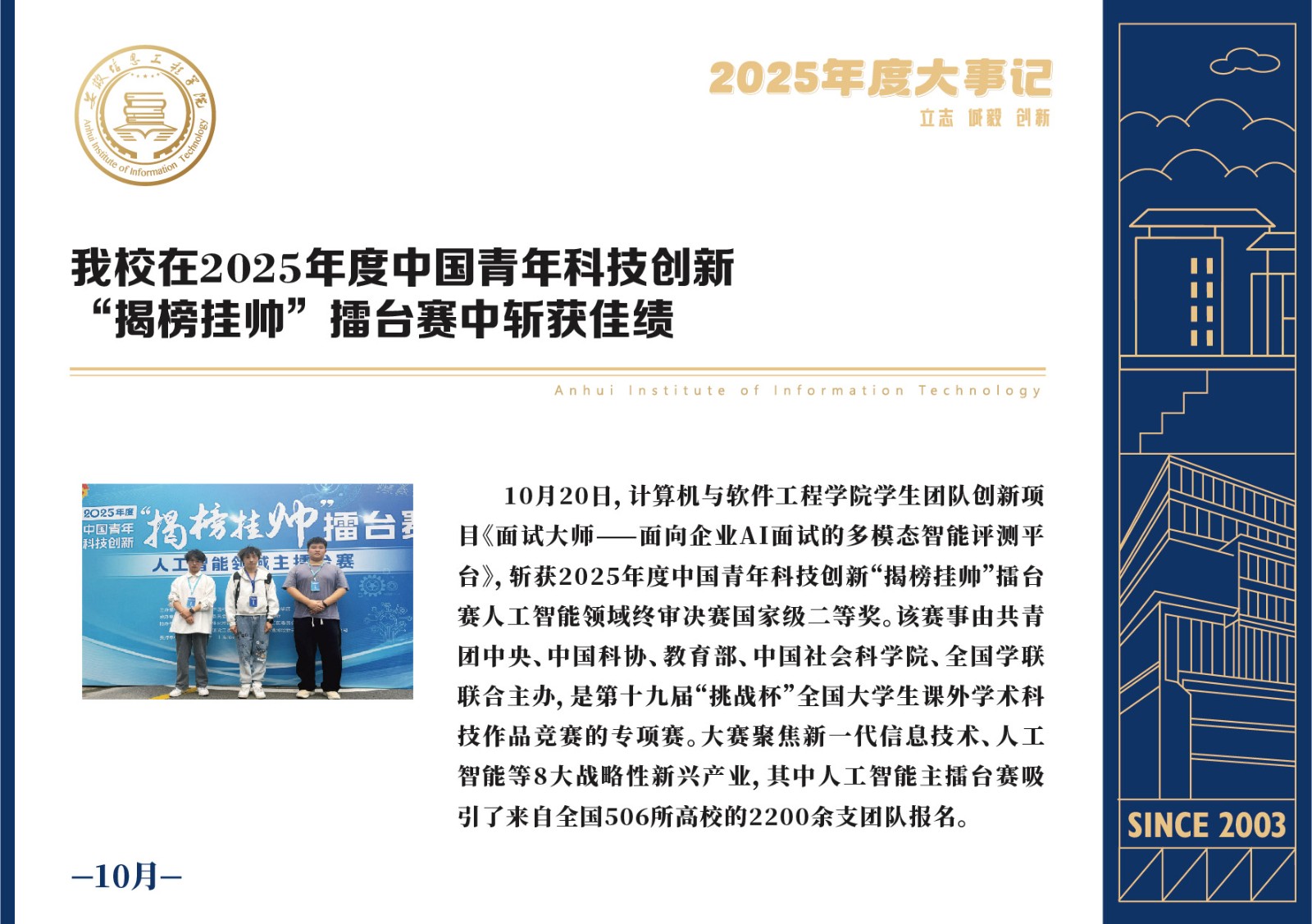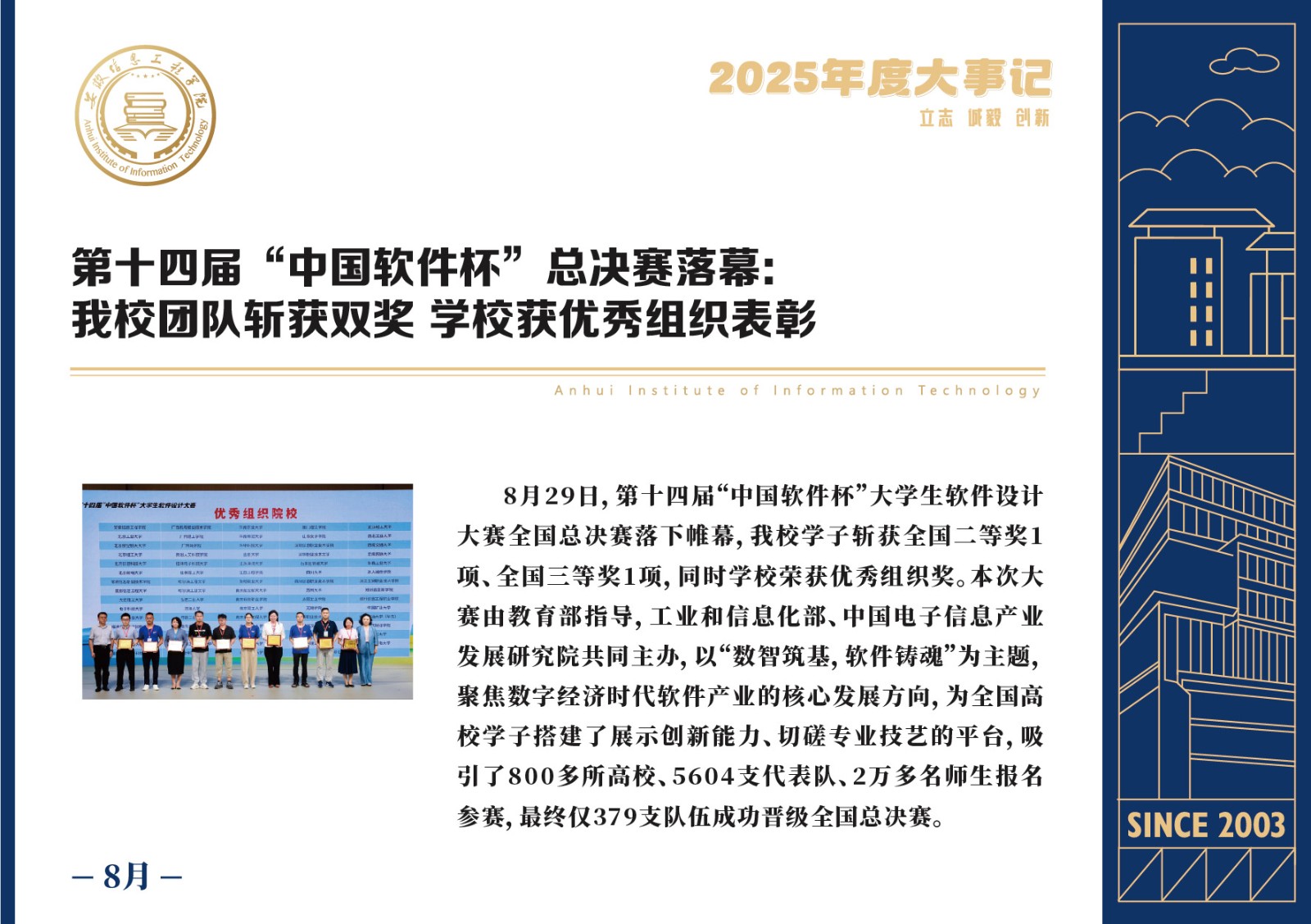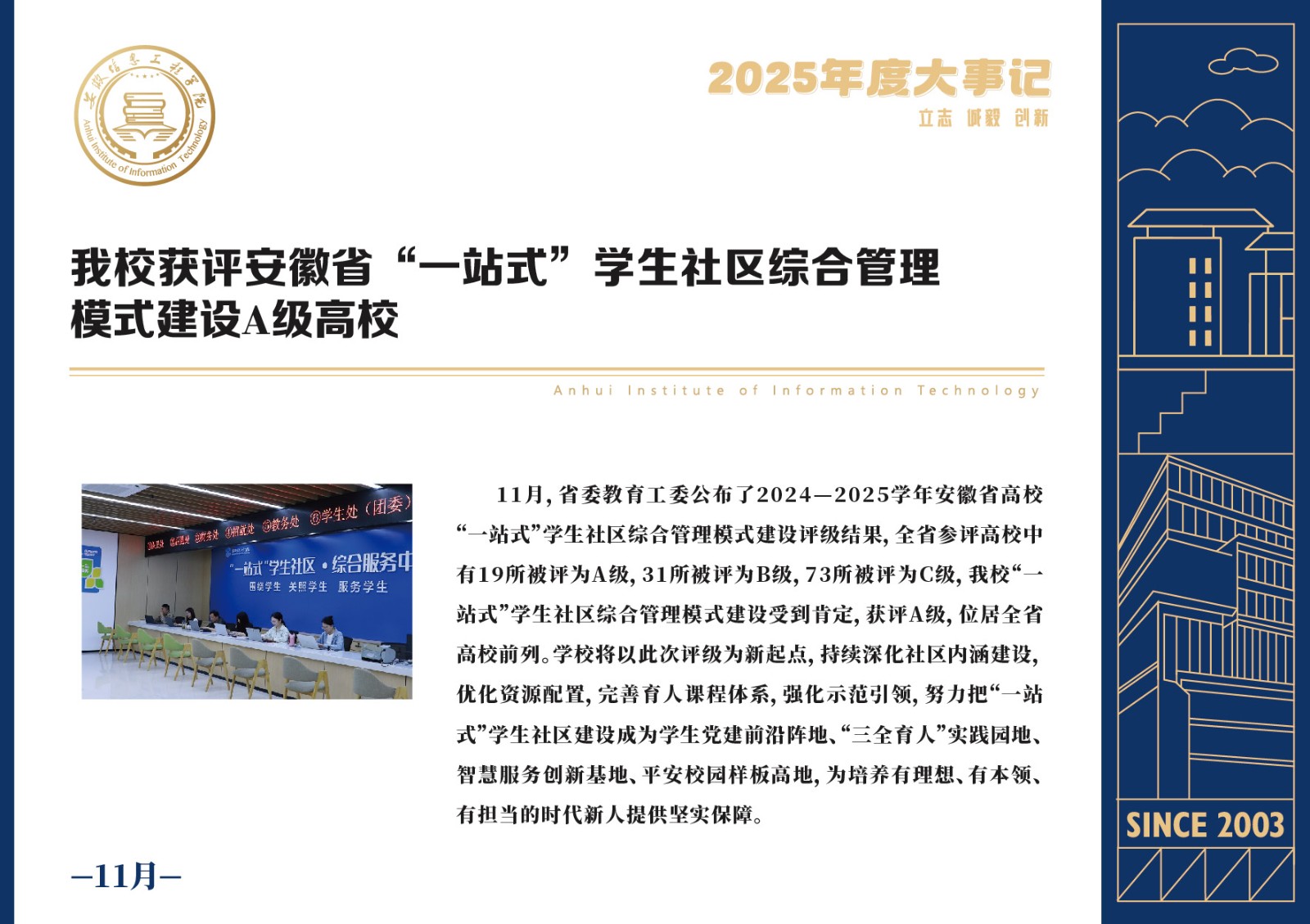编者按 岁序更迭,华章日新。2025年,是安徽信息工程学院在高质量发展道路上勇攀新峰、跨越前行的一年。这一年,我们高举旗帜、培根铸魂,党的建设坚定有力。这一年,我们聚焦主业、锐意革新,人才培养与教育教学改革结出累累硕果。这一年,我们聚力创新、服务社会,科研能级与学科建设实现历史跨越。这一年,我们以生为本、涵养生态,育人环境与校园文化焕发勃勃生机……每一个事件,都凝聚着信工人的智慧与汗水,每一次跨越,都彰显着学校“为党育人、为国育才”的使命担当。