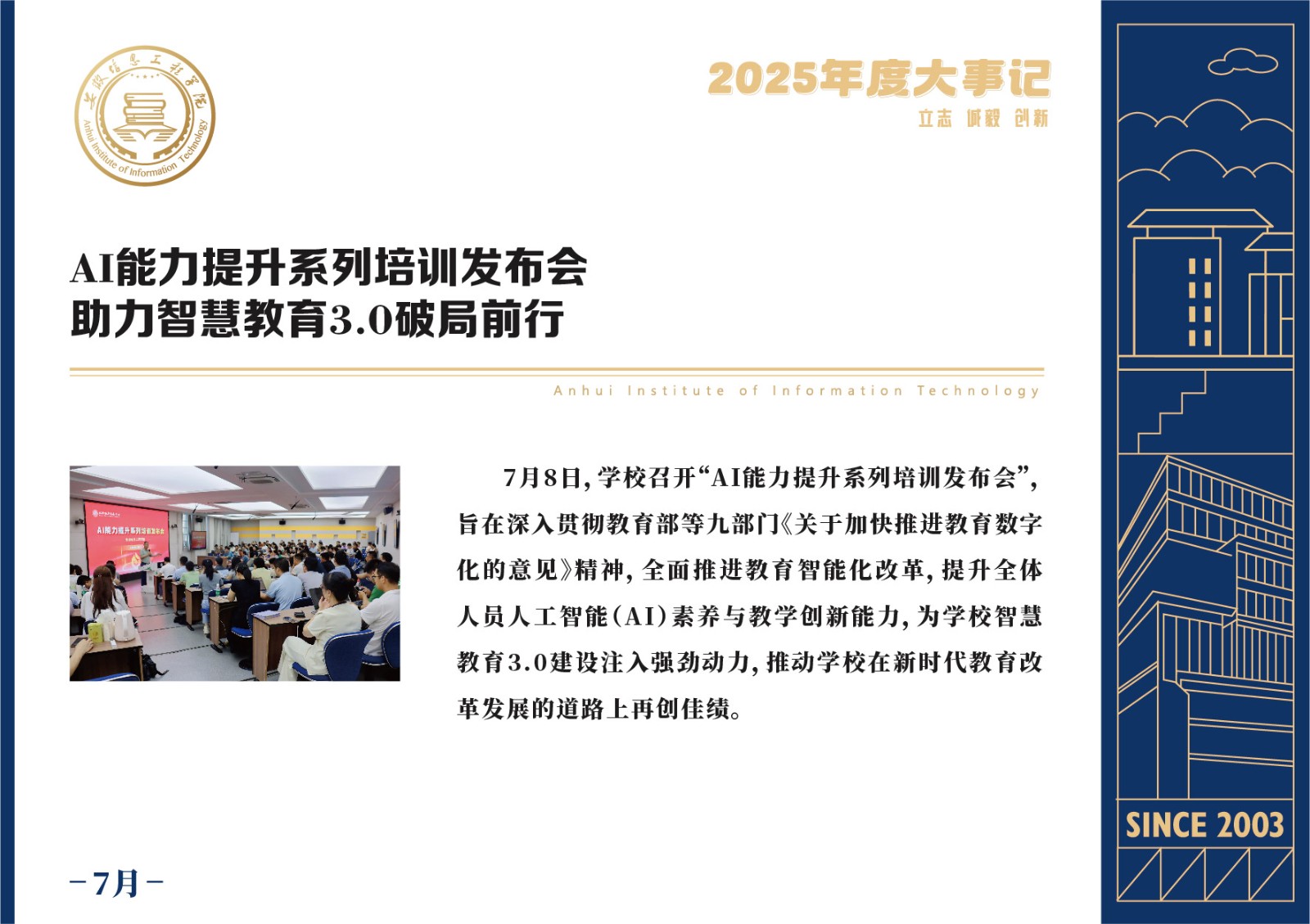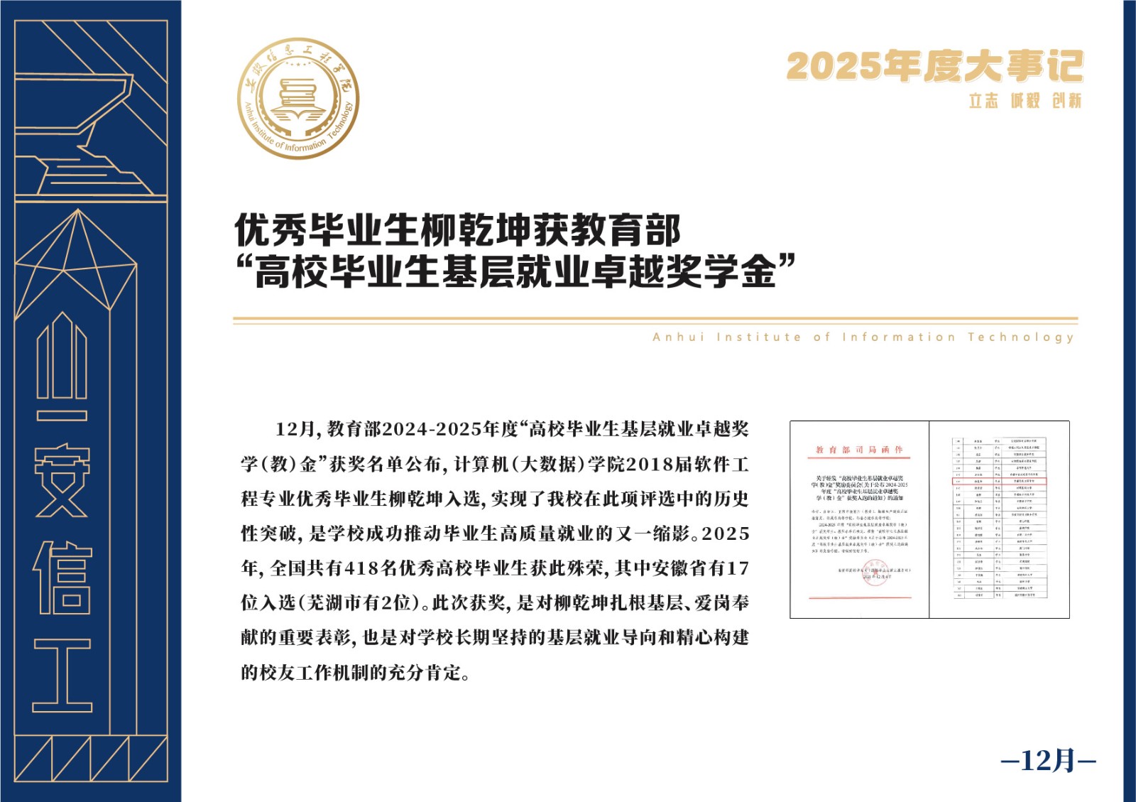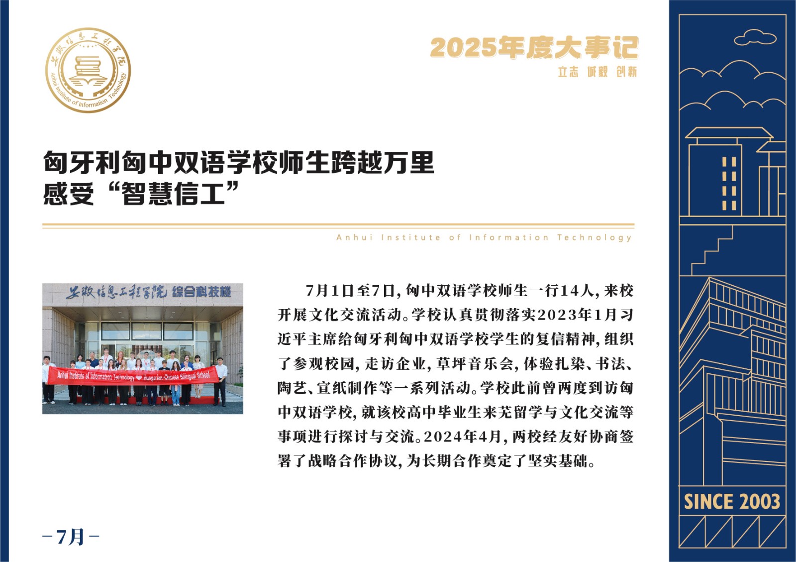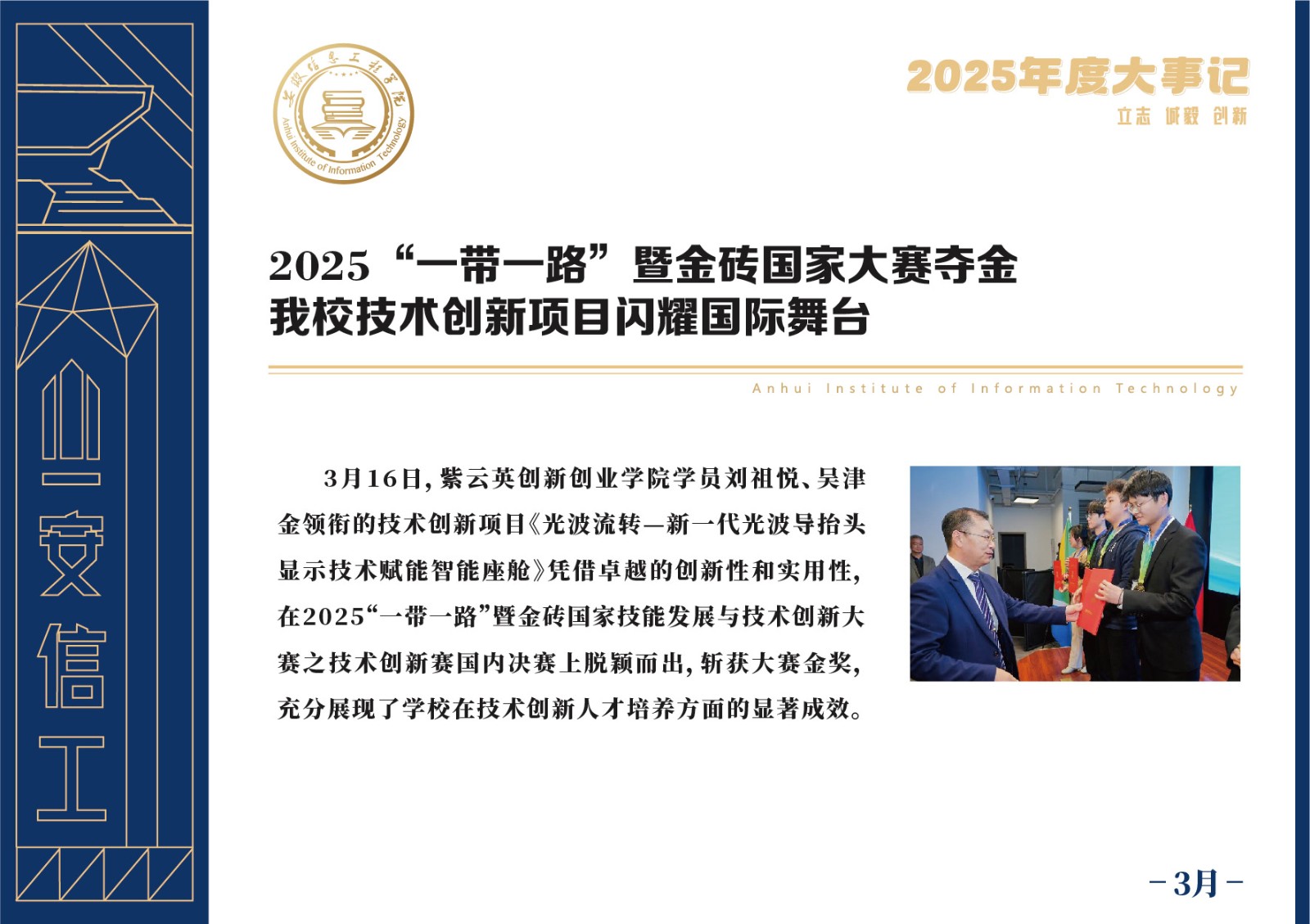 编者按 岁序更迭,华章日新。2025年,是安徽信息工程学院在高质量发展道路上勇攀新峰、跨越前行的一年。这一年,我们高举旗帜、培根铸魂,党的建设坚定有力。这一年,我们聚焦主业、锐意革新,人才培养与教育教学改革结出累累硕果。这一年,我们聚力创新、服务社会,科研能级与学科建设实现历史跨越。这一年,我们以生为本、涵养生态,育人环境与校园文化焕发勃勃生机……每一个事件,都凝聚着信工人的智慧与汗水,每一次跨越,都彰显着学校“为党育人、为国育才”的使命担当。