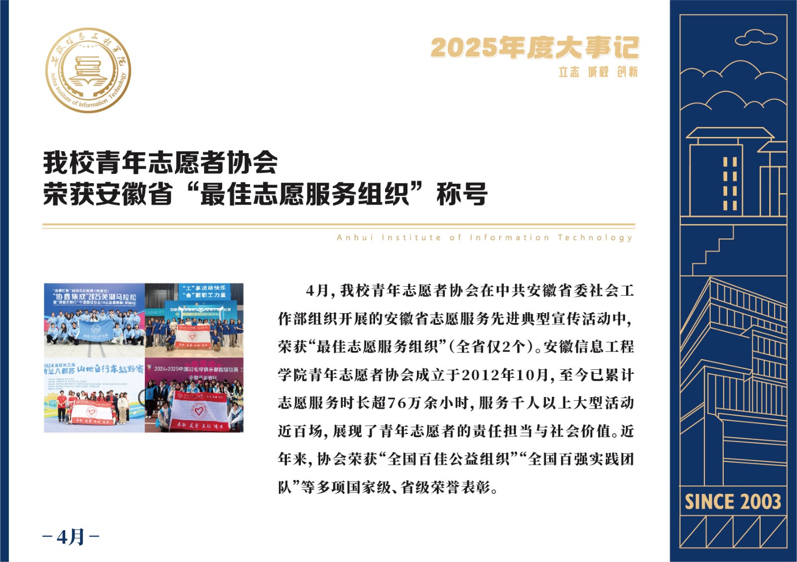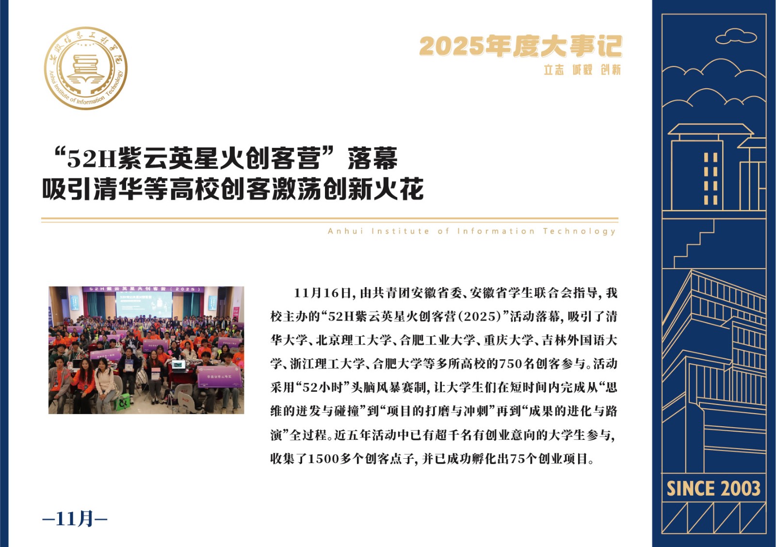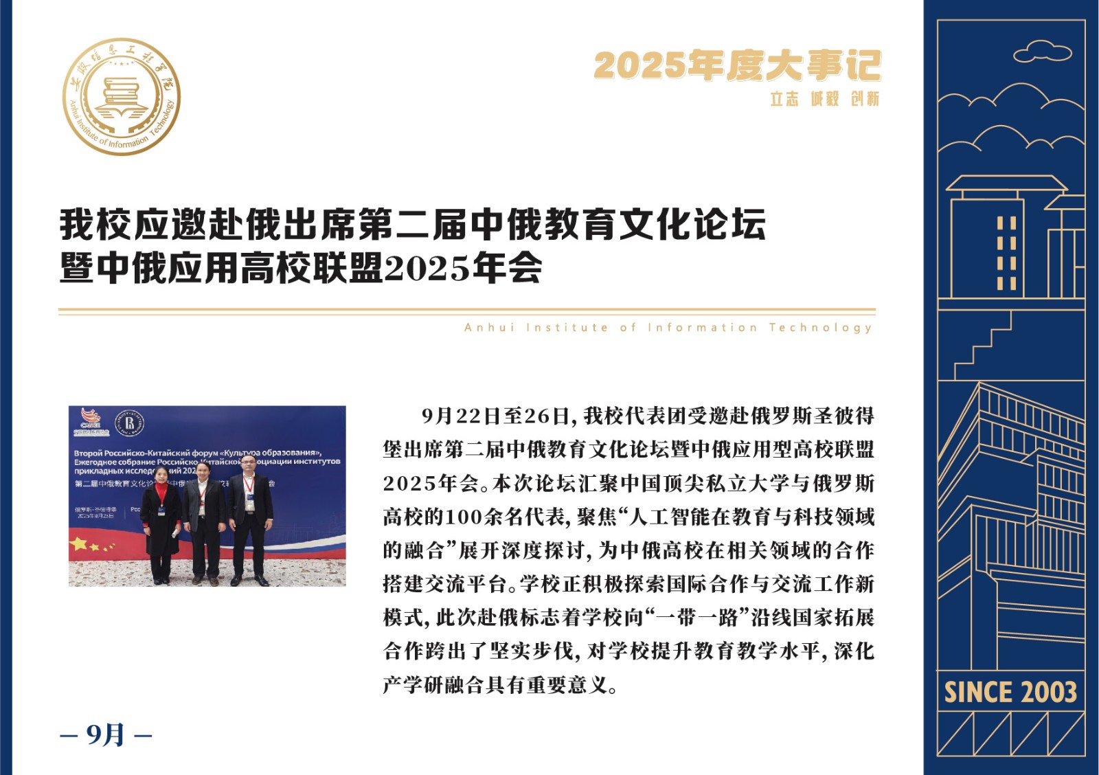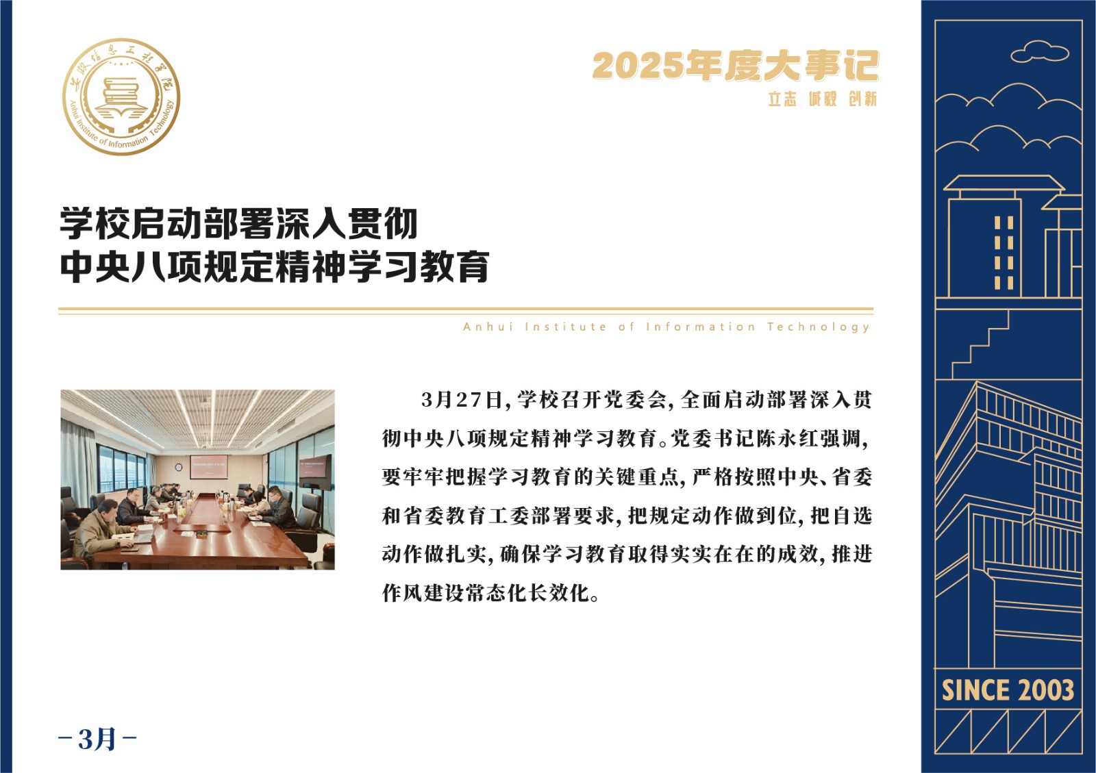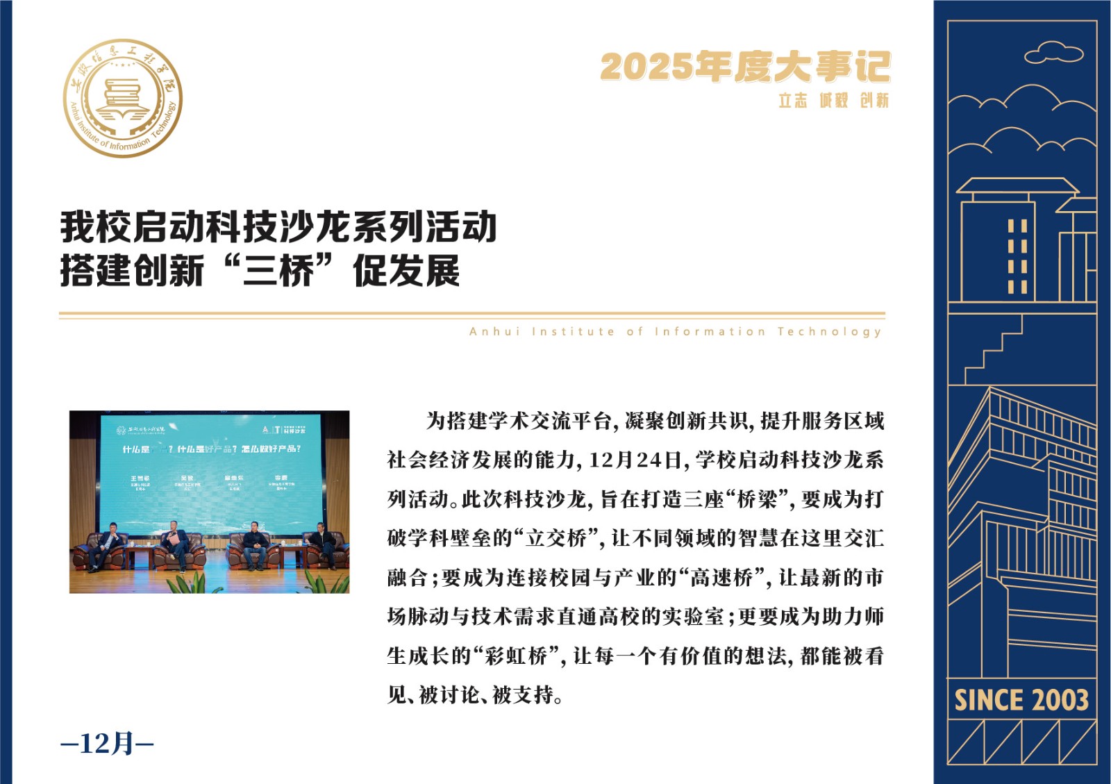 编者按 岁序更迭,华章日新。2025年,是安徽信息工程学院在高质量发展道路上勇攀新峰、跨越前行的一年。这一年,我们高举旗帜、培根铸魂,党的建设坚定有力。这一年,我们聚焦主业、锐意革新,人才培养与教育教学改革结出累累硕果。这一年,我们聚力创新、服务社会,科研能级与学科建设实现历史跨越。这一年,我们以生为本、涵养生态,育人环境与校园文化焕发勃勃生机……每一个事件,都凝聚着信工人的智慧与汗水,每一次跨越,都彰显着学校“为党育人、为国育才”的使命担当。