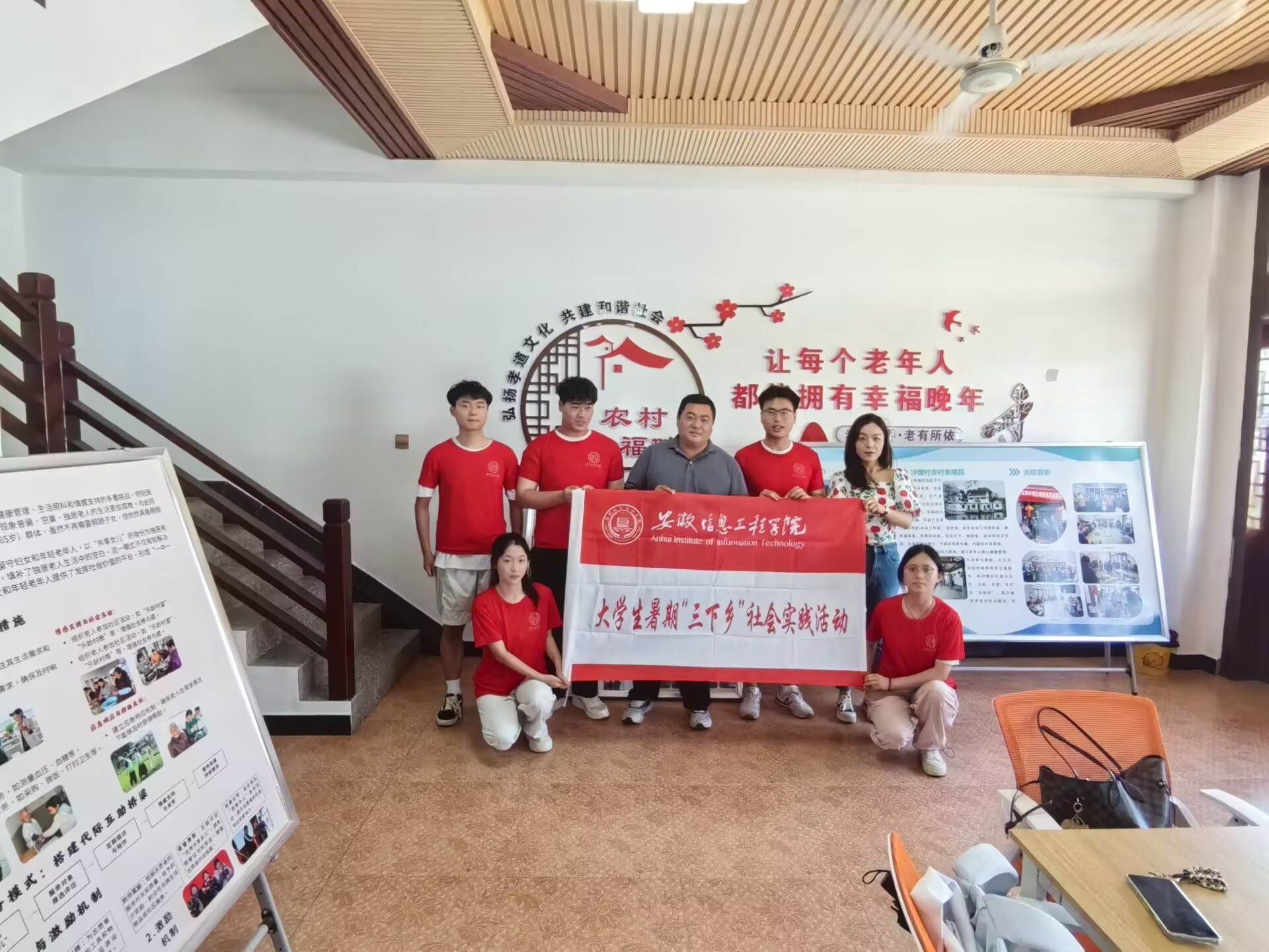 安徽信息工程学院暑期“三下乡”“鸠兹青野”社会实践团前往鸠兹湾,开展了一系列兼具深度与温度的社会实践活动。在这片隐匿于皖南丘陵、因“生态+文旅”融合发展备受关注的村落,实践团成员们不仅探访了自然与人文交织的乡村风貌,更与当地达成合作,为校地协同助力乡村振兴拉开序幕。(图为实践团成员与指导老师合影)探访村落:在守旧与创新中读懂鸠兹湾微风裹挟着草木清香,实践团在负责人的全程带队讲解下,开启了鸠兹湾的采景之行。刚入村口,两侧的民居便展现出独特魅力:斑驳的马头墙保留着百年肌理,墙根却嵌着太阳能路灯;木门铜环泛着旧光,推开后却是落地窗通透的咖啡馆,老木料与现代设计碰撞出和谐韵律。(图为鸠兹湾厨房和酒吧夜景及议事亭)从农耕文化馆的老式水车到山坡上的星空露营地,从村民自营的手作豆腐坊到研学团队写生的稻田画室,再到“网红打卡点”稻田酒吧,鸠兹湾的“生长逻辑”清晰可见:不拆老房、不砍古树,让现代便利悄悄“长”进古村落肌理。午后,实践团开启采景之旅。田埂上,老农弯腰插秧的身影与稻苗新绿、草帽麦黄构成鲜活农耕