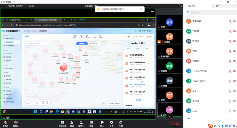 本网讯 为推进教育数字化转型,赋能教师智慧课程建设能力,2月18日上午,教务处联合科大讯飞技术团队线上举办“课程知识图谱建设专题培训交流会”。各学院智慧课程负责人及骨干教师参与培训,共同探讨人工智能技术赋能教学创新的实践路径。(线上培训)培训会上,讯飞工程师围绕“知识图谱驱动的教学改革”主题展开系统讲解。通过案例演示,专家剖析了知识图谱如何解构课程核心知识点、构建学科知识逻辑网络,并依托智能平台实现个性化学习路径推荐、学情动态诊断等功能。针对教师关注的实操问题,现场展示了知识图谱构建工具的操作流程,涵盖知识节点标注、关系关联、资源整合等关键步骤,为教师后续自主开发提供技术指引。互动交流环节,参训教师结合自身课程特点与技术团队展开热烈讨论。例如,艺术学院教师探讨如何实现图片作业的智能识别与批改,工科教师则关注实践环节与理论知识的融合应用。教务处相关负责人表示,知识图谱建设是推进“AI+教育”落地的重要抓手,未来将建立专项支持机制,为教师提供平台、技术及专家指导,推动校级智慧课程资源库建设。